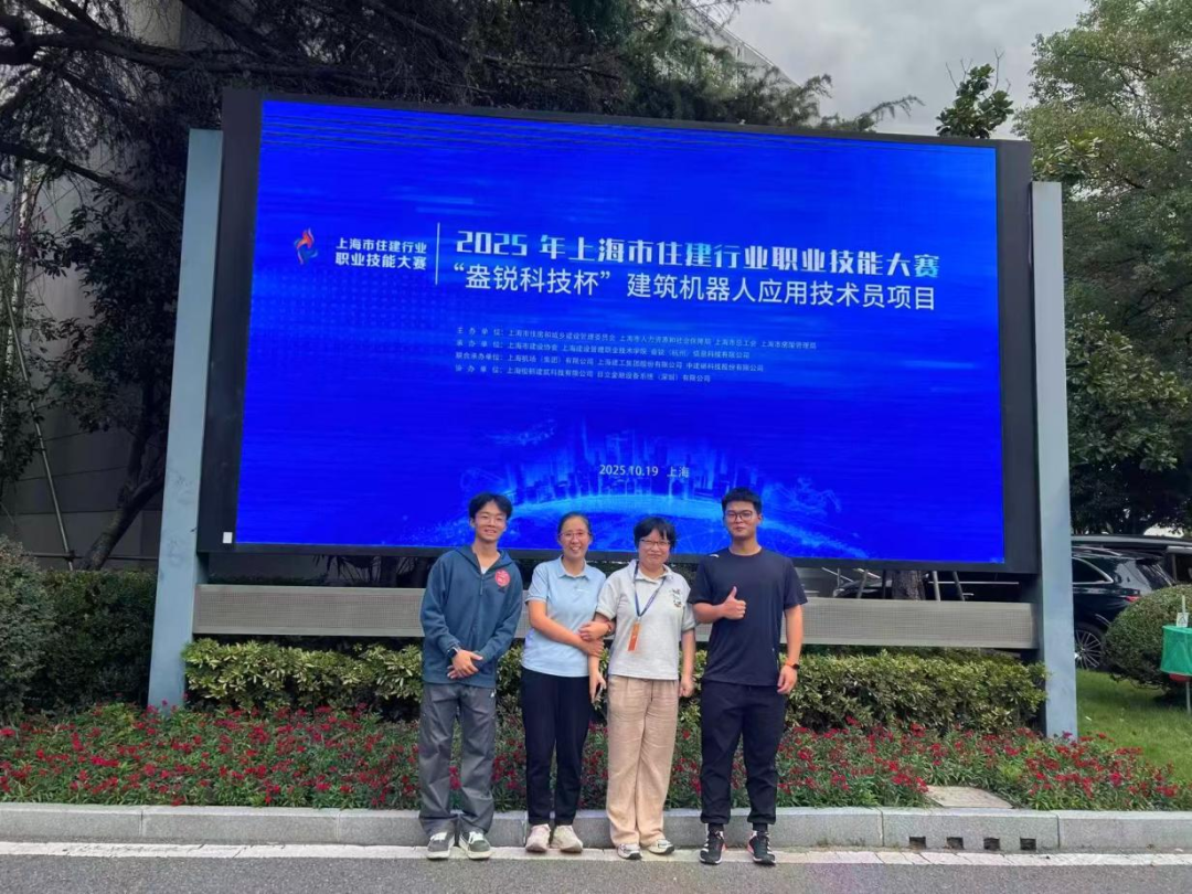 在2025年上海市住建行业职业技能大赛建筑机器人应用技术员项目中,上海建设管理职业技术学院代表队凭借出色的协作与扎实的专业能力,荣获金奖。团队由指导教师郭晓娟,以及队员宋荣敏、李宇帅、王梦炳四名成员共同组成,秉持“技术融合、实践创新、教学相长”的理念,形成了教师引领、师生协作、优势互补的良好合作模式。郭晓娟老师凭借丰富的专业教学经验与行业洞察,为团队提供全面的技术指导与备赛支持;宋荣敏老师负责智能建造技术方案编制、汇报及实测实量机器人操作,充分发挥其行业挂职经验优势,将理论方法与工程实践紧密结合;李宇帅同学专注于安全巡检机器人的操作与系统调试,确保施工环境的安全监控与实时反馈;王梦炳同学则熟练掌握放样机器人操作,保障施工定位的精准高效。四人分工明确、协同作业,共同攻克技术难点,实现从方案设计到现场实操的全程贯通。