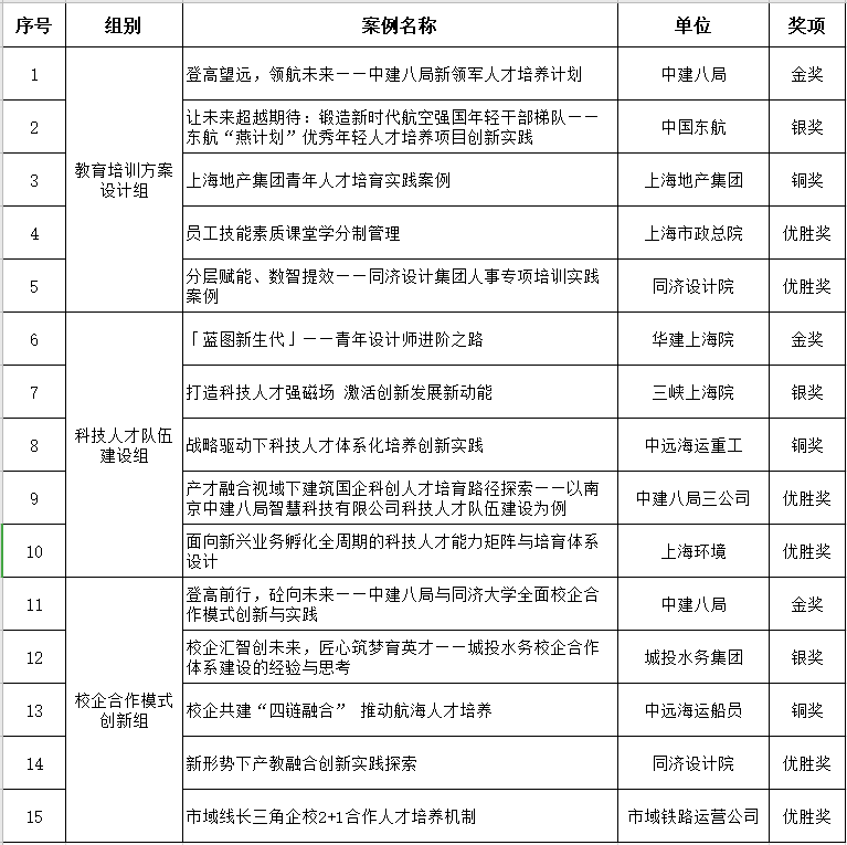 ¤ ¤ ¤ ¤优秀HR案例展示环节,多家联盟成员单位分享了在“教育培训方案设计”、“科技人才队伍建设”、“校企合作模式创新”等领域的15个实践举措。经初赛评审、决赛展示,最终“登高望远,领航未来——中建八局新领军人才培养计划”、“「蓝图新生代」——华建集团上海建筑设计研究院青年设计师进阶之路”、“登高前行,砼向未来——中建八局与同济大学全面校企合作模式创新与实践”等3个案例获金奖,另有12个案例分获银奖、铜奖及优胜奖。展现了联盟各单位在人力资源管理与创新实践中的优秀成果,为行业提供了可复制、可推广的宝贵经验。